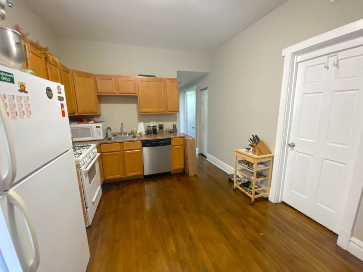Enjoy beautiful hardwood floors throughout, two similarly sized bedrooms, and an updated bathroom featuring a spa-like shower. The generously sized kitchen includes a dishwasher and offers plenty of room for a dining table, plus space that could easily double as a small work-from-home setup.